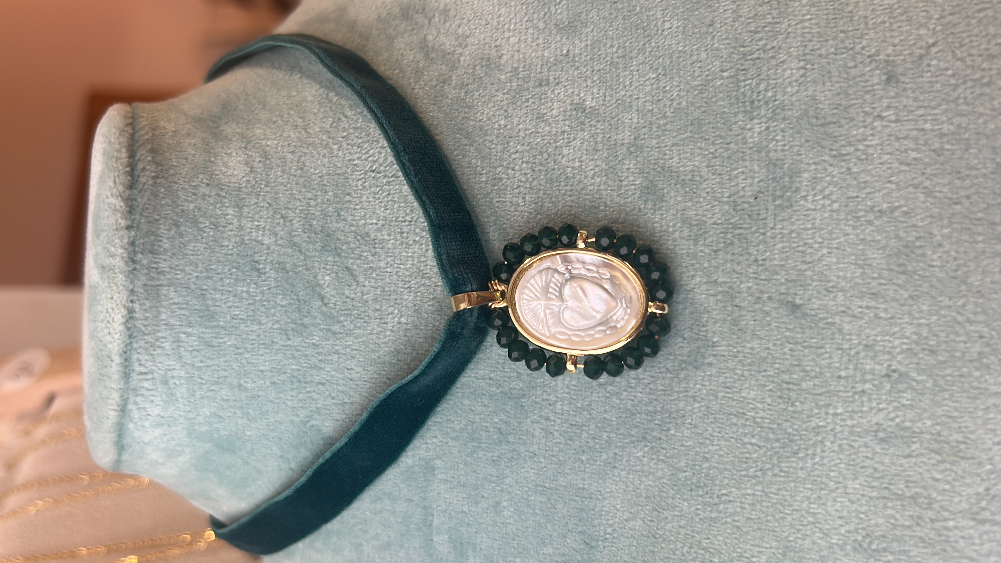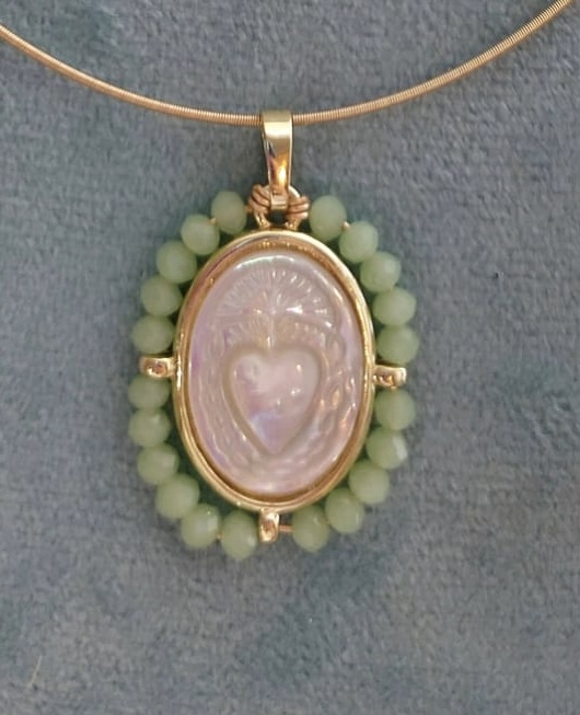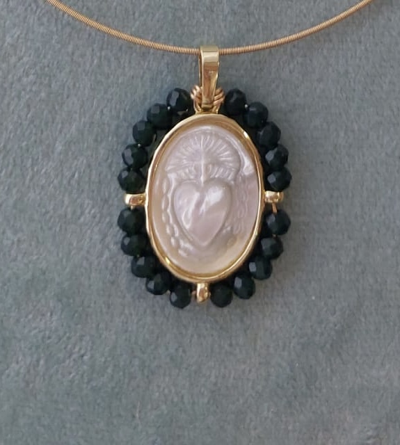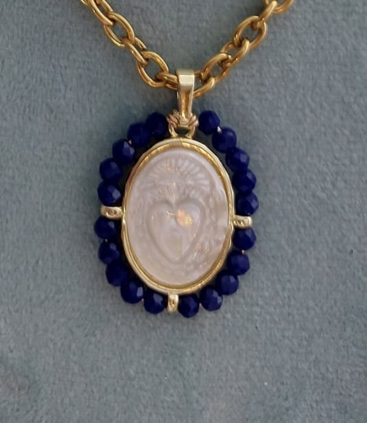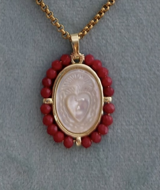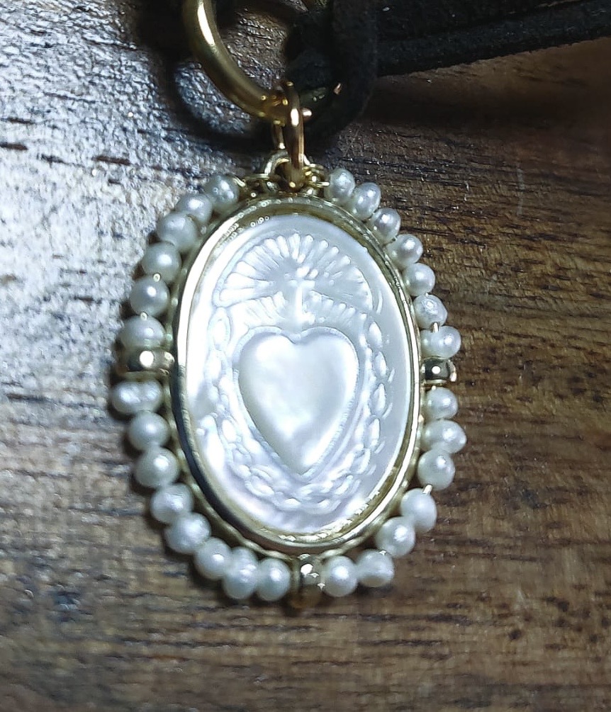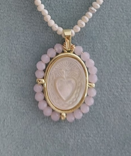 Cadena con medalla Sagrado Corazón de Jesús en nácar con cristales facetados.