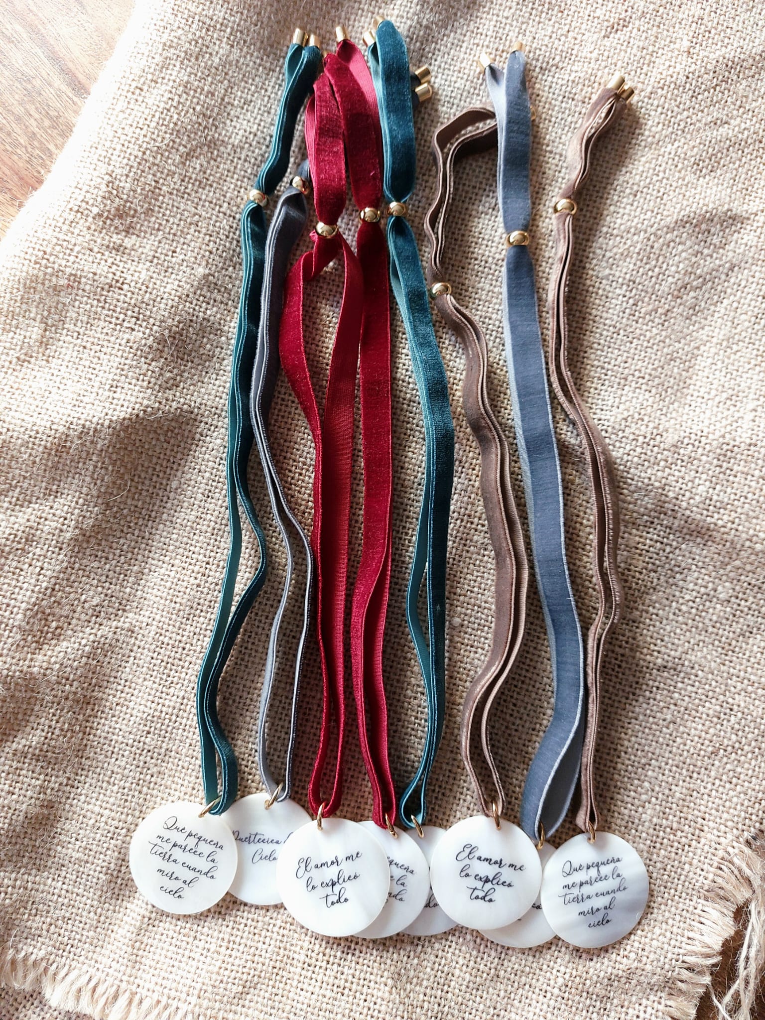 Cinta de terciopelo elástico en colores a elegir, con anilla de cierre y terminaciones en acero.