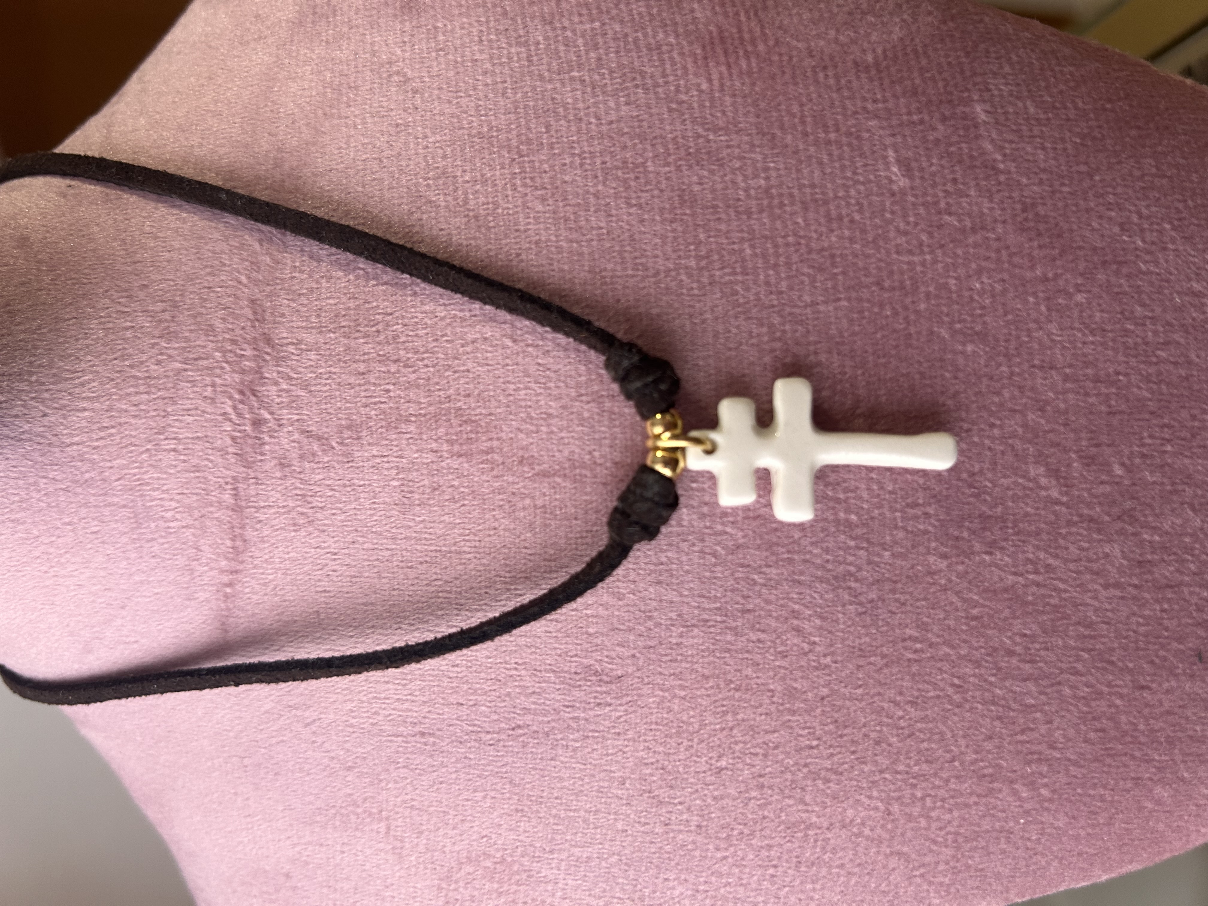 Gargantilla de cuero con cruz de Caravaca de cerámica hecha a mano.