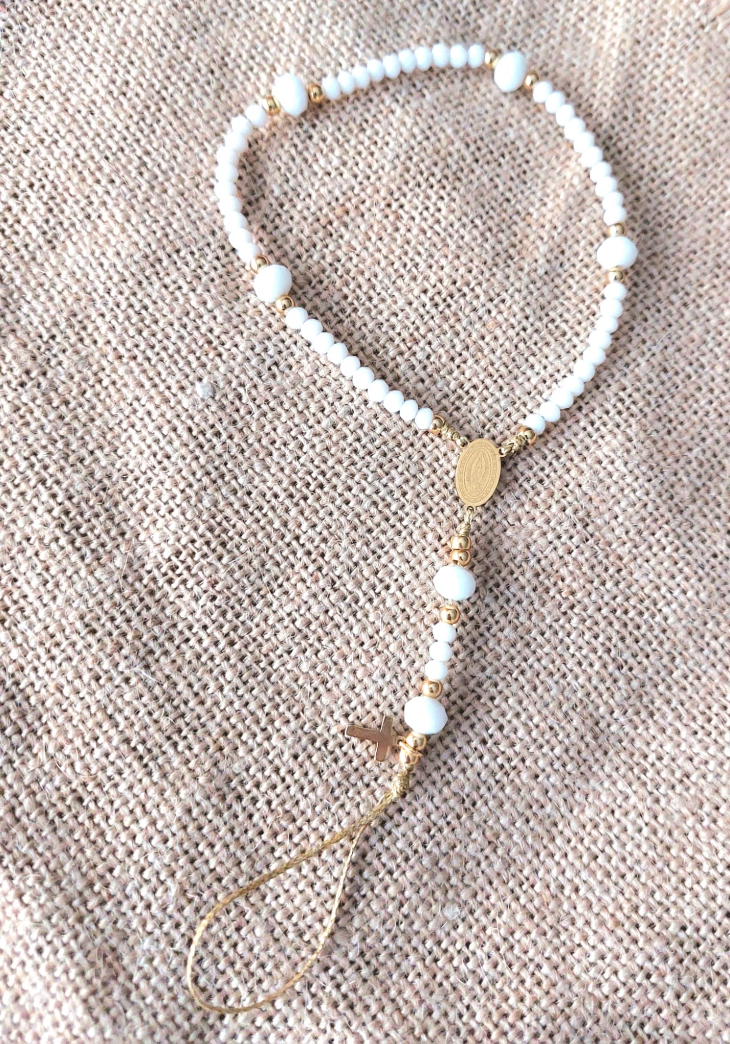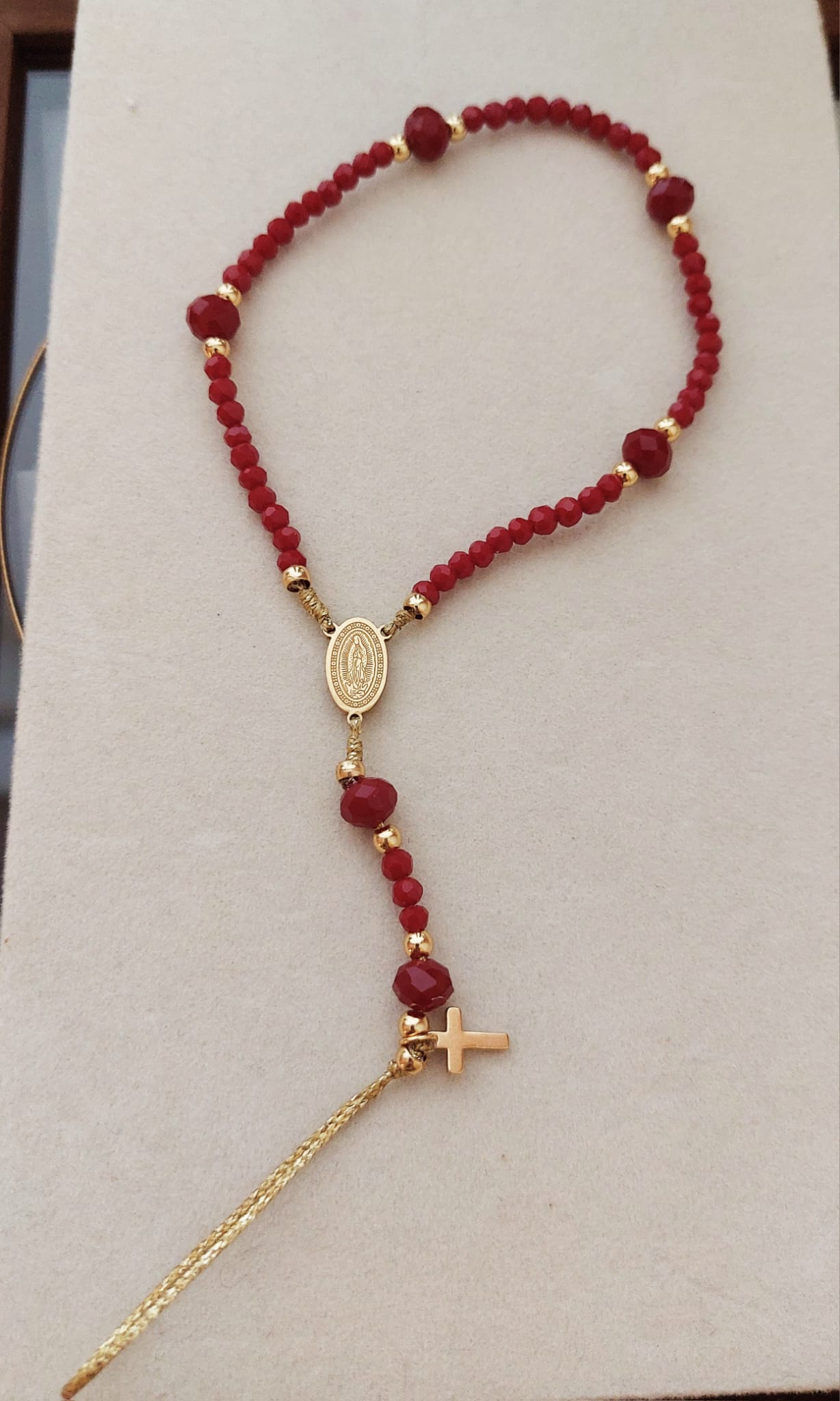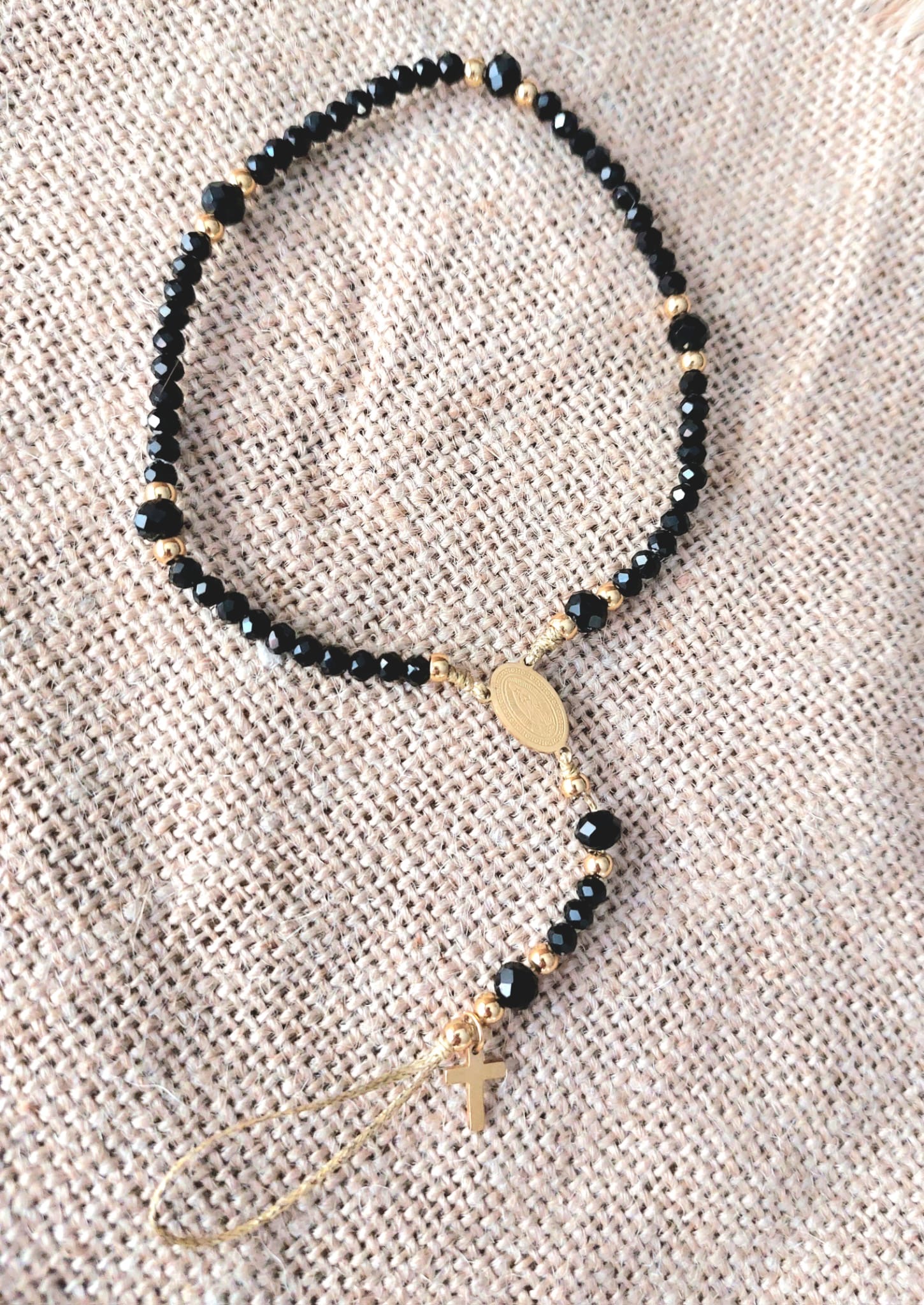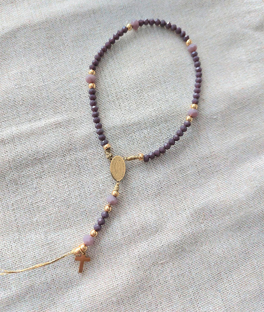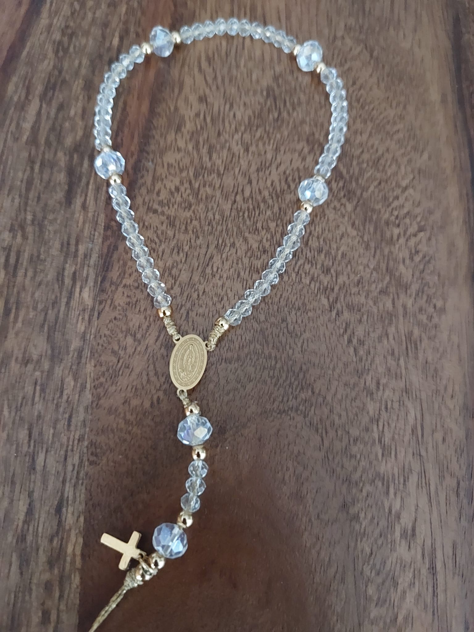 Rosario de cristal facetado y acero, para llevar engarzado en la funda del móvil.